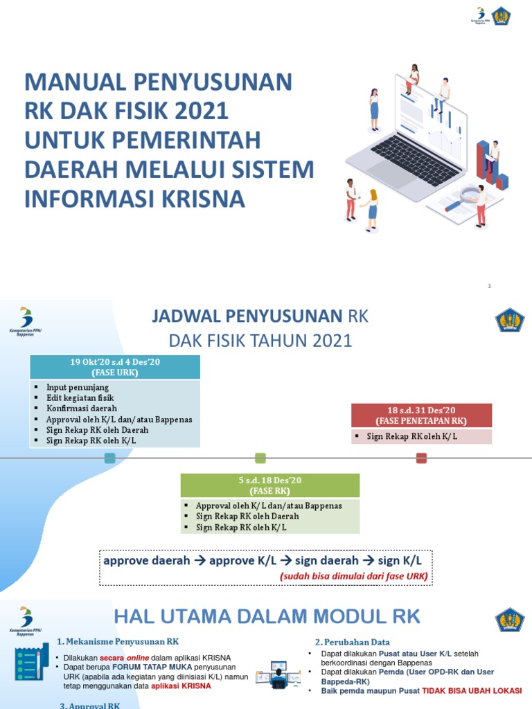 Manual Krisna B5 2 0 Pdf from imgv2-2-f.scribdassets.com We would like to show you a description here but the site won't allow us. Jun 09, 2021 · bappenas memperoleh pagu anggaran rp 1,37 triliun pada tahun depan untuk 22 kegiatan utama, salah satunya program koordinasi untuk pemindahan ibu kota. Bit.ly/daftarakunkrisnadak2019 • pengiriman surat resmi : Sosialisasi kebijakan did dan pengunaan indikator stunting dalam pengalokasian did kepada pemerintah daerah, direktur dana transfer umum, ditjen. Sistem ini akan memudahkan instansi pemerintah dalam merencanakan program/kegiatan, sekaligus menurunkan biaya dalam proses perencanaan dan penganggaran. (dimas nanda krisna/sandi arizona/rinto a navis) • daerah yang melakukan perubahan admin di krisna.systems dapat menyampaikan surat kepada direktorat pembang daerah dan direktorat alokasi pendanaan pembangunan kementerian ppn/bappenas dari kepala bappeda serta mohon dapat di update : May 21, 2021 · mekanisme pengusulan dak fisik ta 2022 melalui sistem informasi krisna 2022, direktorat pembangunan alokasi pembangunan daerah, kementerian ppn/bappenas, agus riyadi download dana insentif daerah :